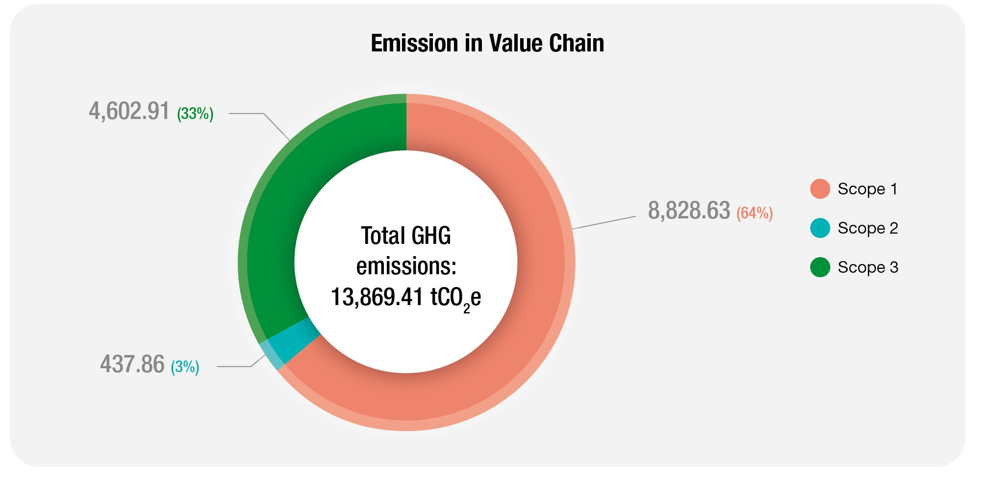 In 2025, the Group’s operations generated 13,869.41 tCO2e of greenhouse gas emissions, comprising 8,828.63 tCO2e from direct emissions (Scope 1), 437.86 tCO2e from indirect emissions associated with electricity consumption (Scope 2), and 4,602.91 tCO2e from emissions arising from the value chain (Scope 33). Scope 1 emissions were primarily attributable to fuel consumption from the operation of the Group’s fleet.