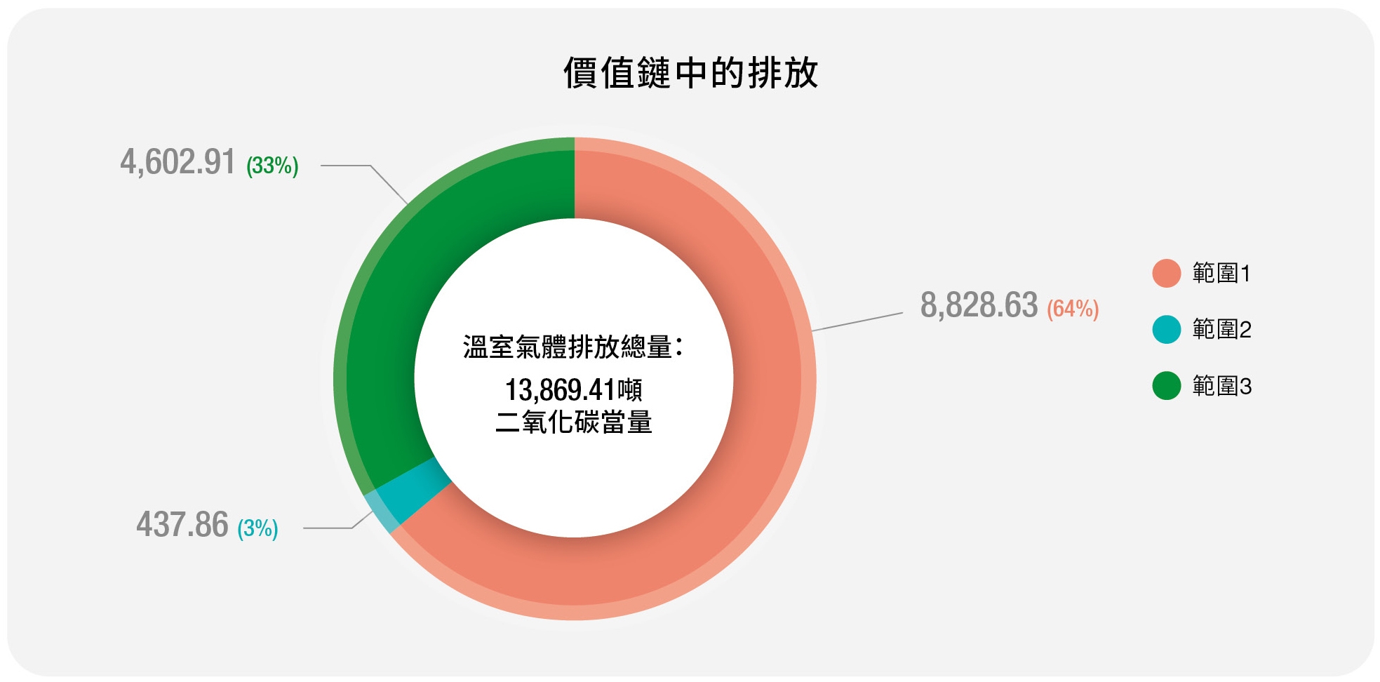 二零二五年,本集團營運產生的溫室氣體排放量為13,869.41噸二氧化碳當量,包括8,828.63噸直接排放量(範圍1)、437.86噸與電力消耗相關的間接排放量(範圍2),以及4,602.91噸源自價值鏈的排放量(範圍33 )。範圍1排放量主要歸因於本集團車隊運作的燃料消耗。