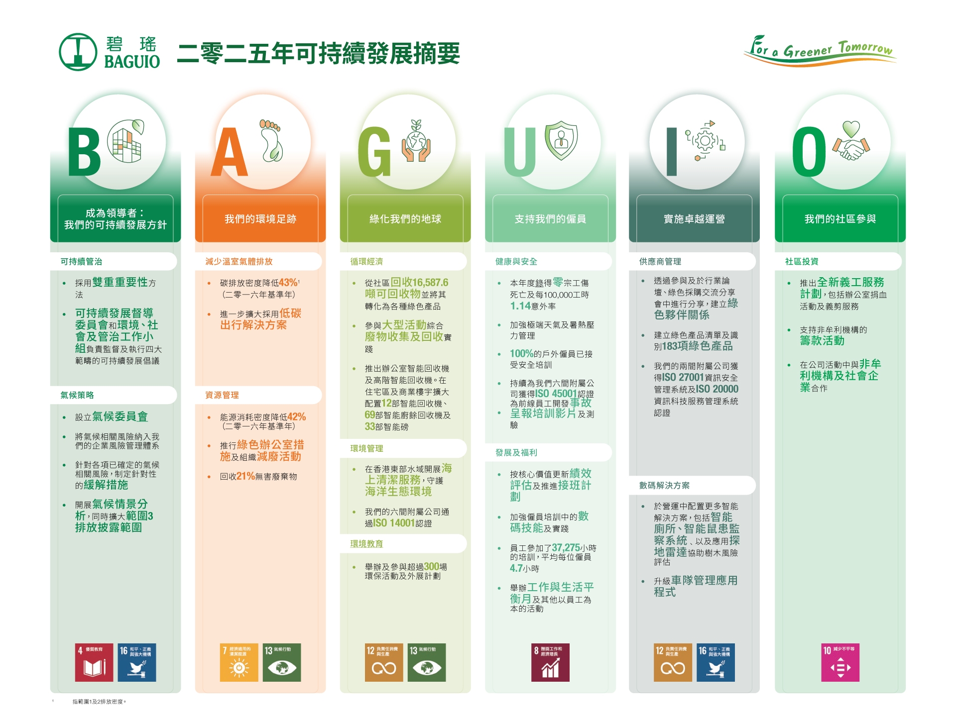 本報告乃我們披露碧瑤在環境、社會及管治方面領域的表現及進展的第十份報告。本報告乃遵照香港聯交所證券上市規則附錄C2所載的環境、社會及管治報告指引編製,並堅持重要性、量化、平衡及一致性的報告原則。今年,我們繼續建立可持續發展報告,涵蓋英文首字母縮略詞「BAGUIO」的所有重要議題,以證明可持續發展對於碧瑤及我們的核心服務屬不可或缺。